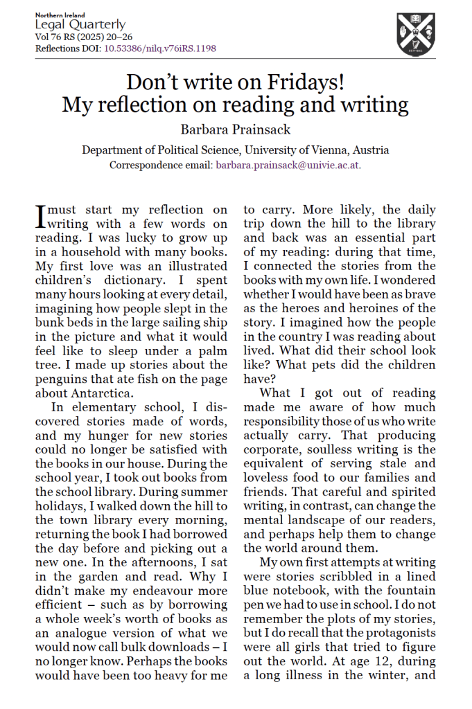 2. Here is my recipe for breaking through writers’ and other blocks. These blocks make us feel that writing is a chore rather than a pleasure. “Don’t write on Fridays”: https://nilq.qub.ac.uk/index.php/nilq/article/view/1198/972 ( 🙏 Mark Flear for inviting me to write this)